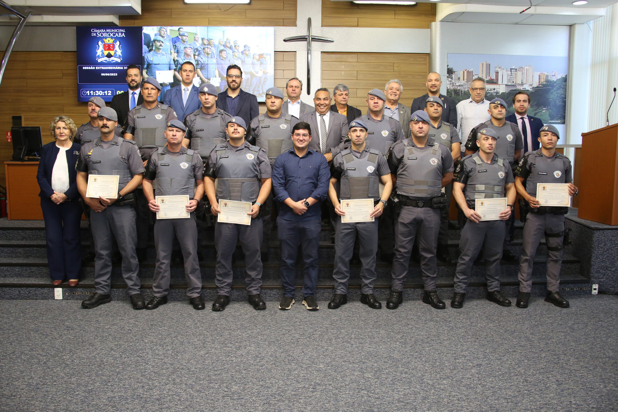 Durante a sessão ordinária desta terça-feira (6), por iniciativa do vereador Aith (PRTB), a Câmara Municipal de Sorocaba homenageou 17 policiais da Força Tática do 7º Batalhão da Polícia Militar do Interior (7º BPM-I) com Voto de Congratulações, pela operação realizada há duas semanas, que resultou na prisão de uma casal de traficantes e na apreensão de 36 quilos de drogas variadas, incluindo 30 frascos de K9.