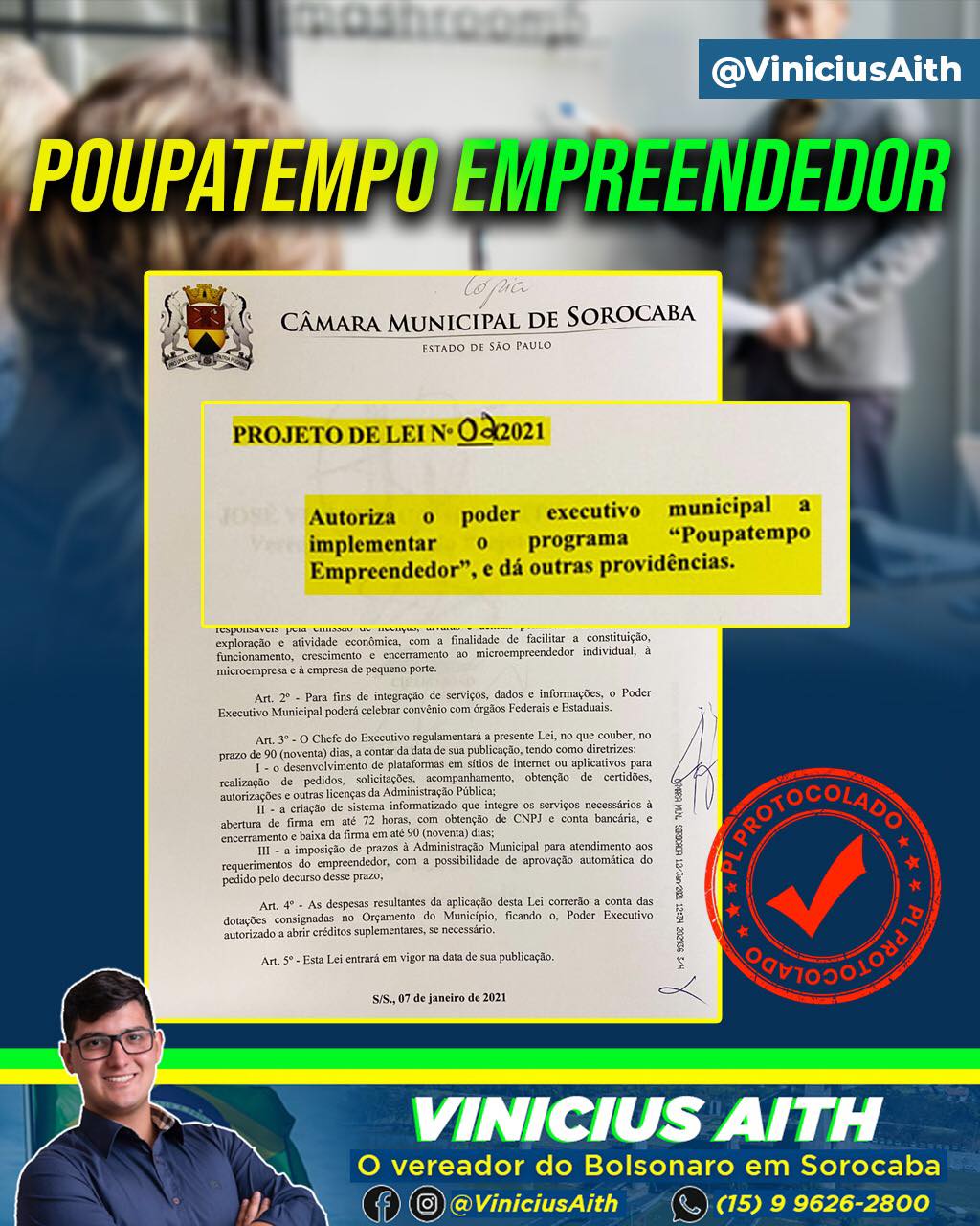 O vereador Vinícius Aith (PRTB) criou um projeto de lei que autoriza a Prefeitura de Sorocaba a implantar o programa “Poupatempo Empreendedor” em Sorocaba. O objetivo do projeto é facilitar e desburocratizar a abertura e o encerramento de microempresas na cidade.