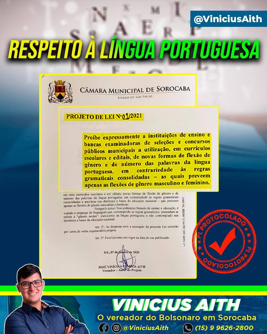 O vereador Vinícius Aith (PRTB) criou um projeto de lei que proíbe, expressamente, que instituições de ensino e bancas examinadoras de seleções e concursos públicos municipais, utilizem em currículos escolares e editais novas formas de flexão de gênero e de número das palavras da língua portuguesa, em contrariedade às regras gramaticais consolidadas – que preveem apenas as flexões de gênero masculino e feminino.